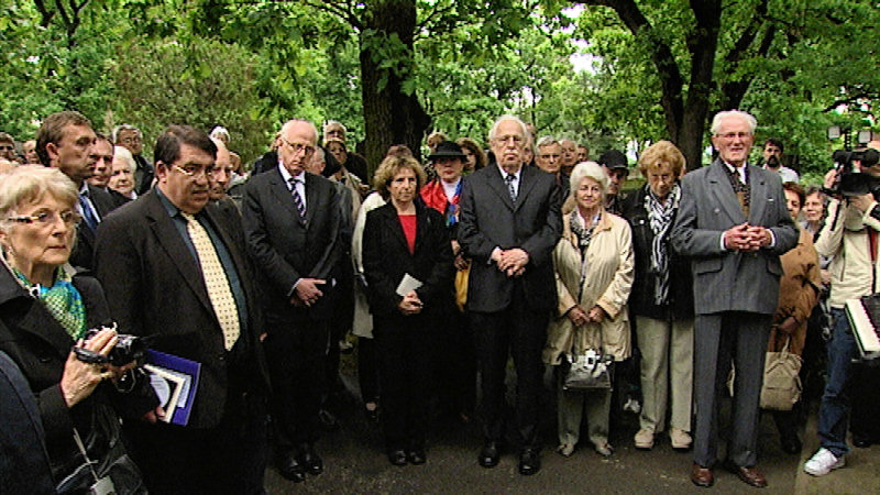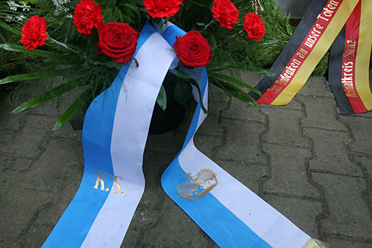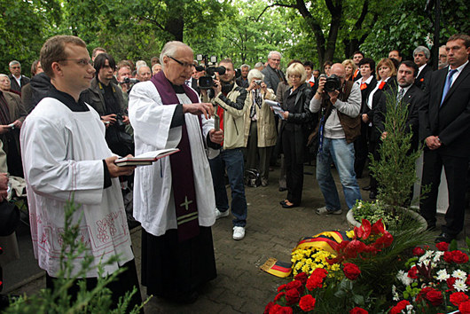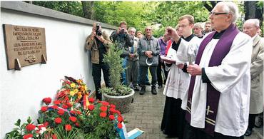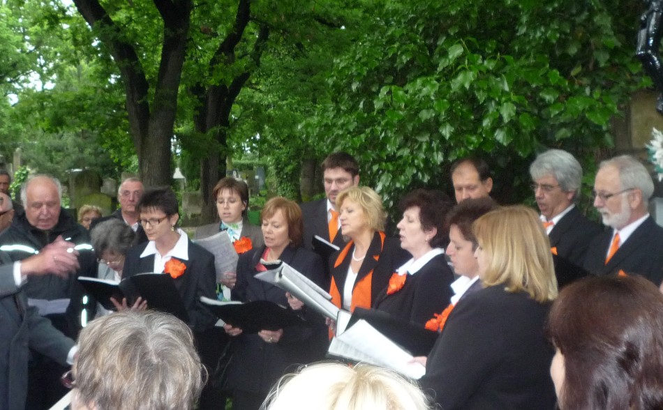 2010-06#03-28 Postelberg, FriedhofDie Einweihung der Gedenktafel wurde für Postelberg zum großen Ereignis. Anwesend waren u. a. die Bürgermeister von Postelberg und Saaz. Der ehemalige tschechische Außenminister Karl zu Schwarzenberg schickte einen Kranz. Unter den deutschen Gästen, darunter viele Angehörige von Opfern, war der deutsche Botschafter, der auch eine Ansprache hielt. Der tschechische Historiker PhDr. Michal Pehr und Uta Reiff, die in Postelberg mit neun Jahren ihren Vater verlor, mahnten in ihren beeindruckenden Reden, die unschuldigen Opfer nicht zu vergessen und es nie wieder zum Krieg kommen zu lassen. Der Chor Rubin umrahmte die Veranstaltung auf würdige Weise musikalisch. Danach gab es zahlreiche Kranzniederlegungen aus dem Publikum.