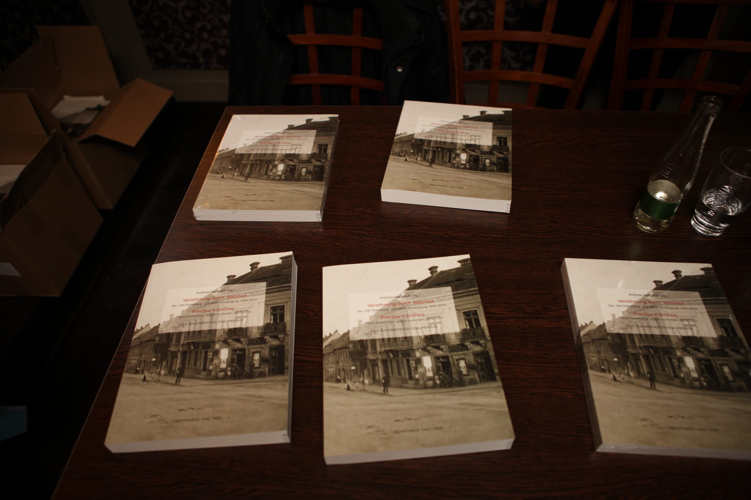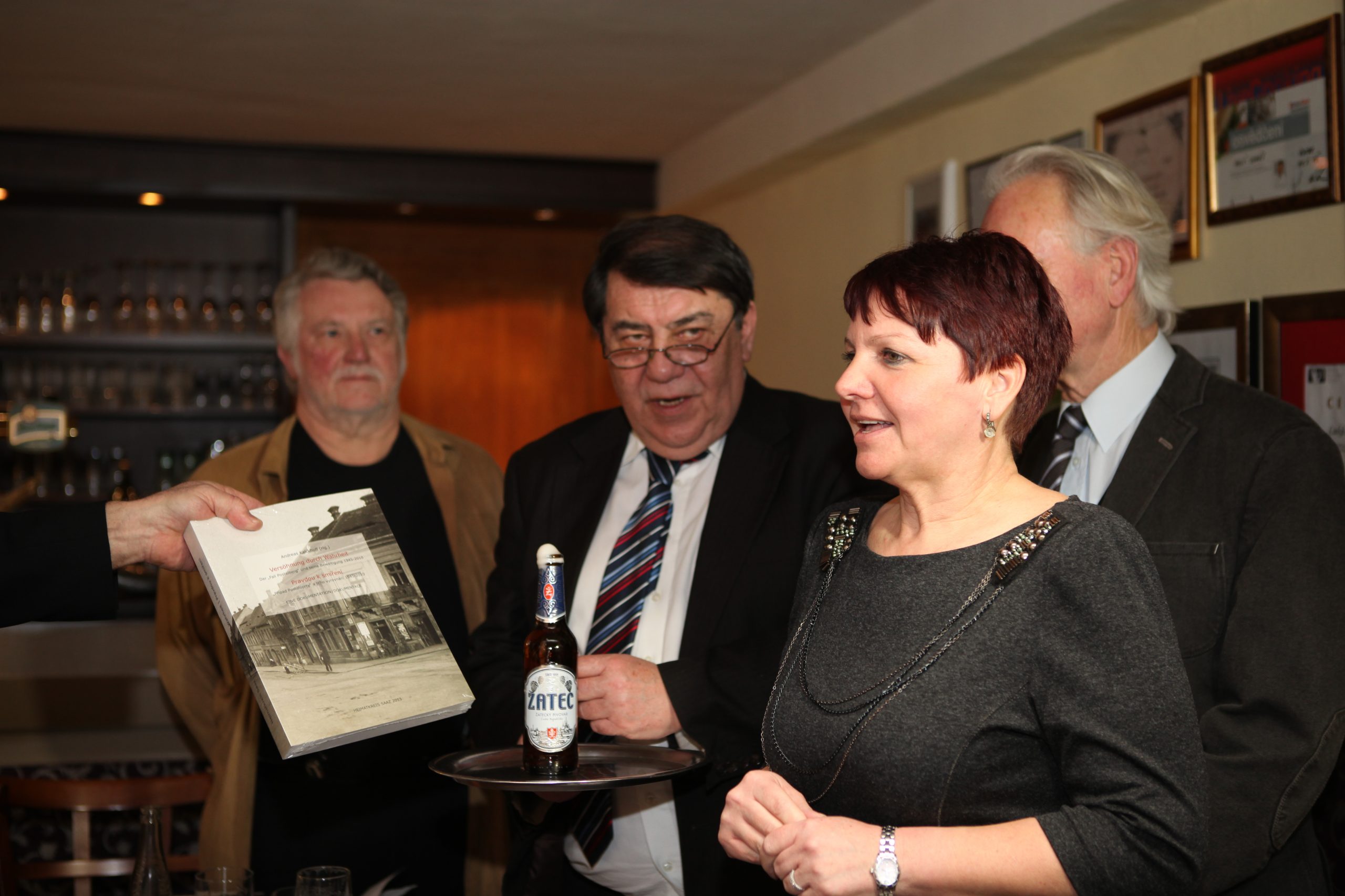 Im Saazer Hotelrestaurant „U Hada“ tauften die Saazer Bürgermeisterin, Zdeňka Hamousová, und der Postelberger Bürgermeister, Václav Ibl zusammen mit dem Vorsitzenden des Heimatkreises Saaz, Adolf Funk, das in Folie eingeschweißte Buch mit Saazer Bier. In den Reden zur Buchvorstellung wurde hervorgehoben, dass es keine Anklage gegen das tschechische Volk ist, denn die Täter sind tot und es gibt keine Kollektivschuld. Vielmehr dient es der gemeinsamen Erinnerung an vergangenes Leid, ohne die keine echte Versöhnung möglich ist. Das drückt auch der Titel des Buches aus: „Versöhnung durch Wahrheit“.