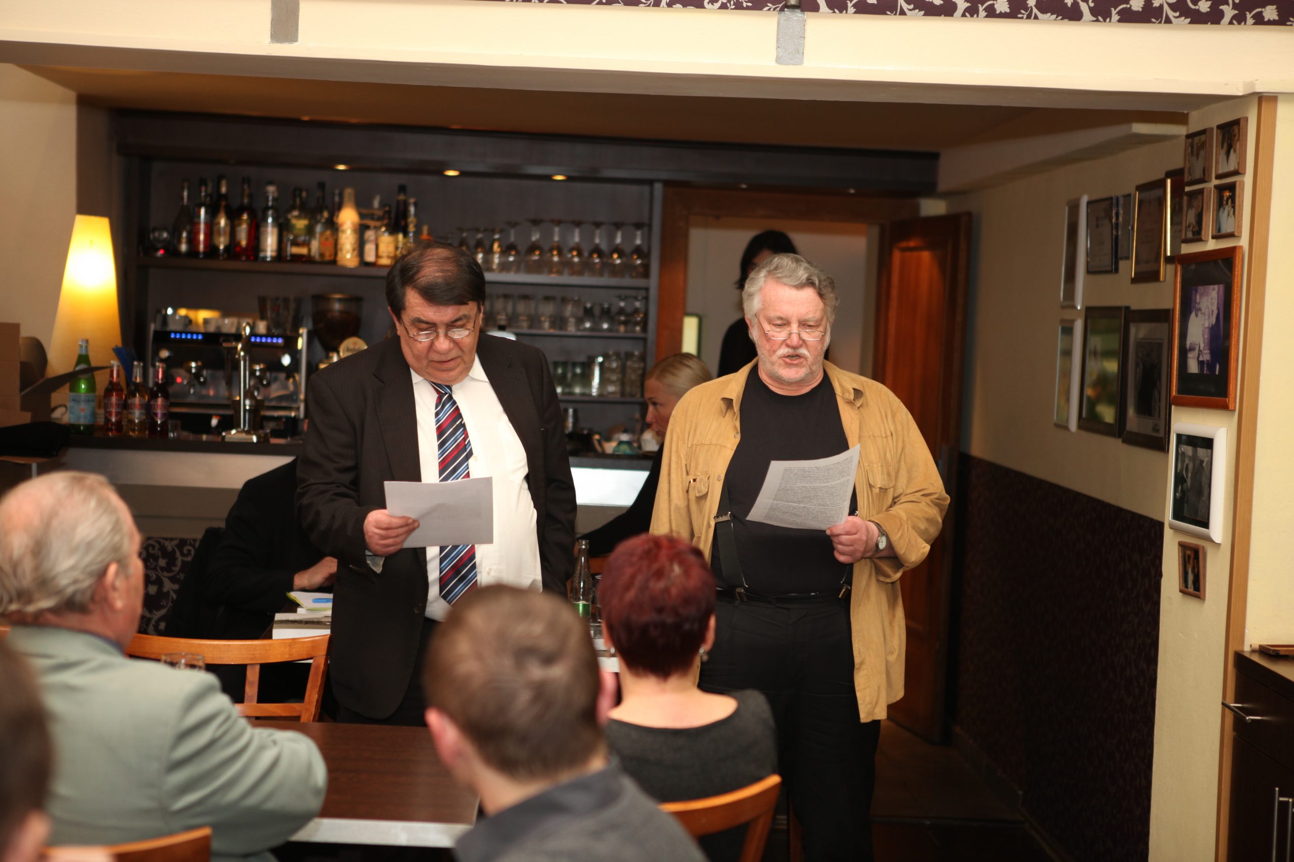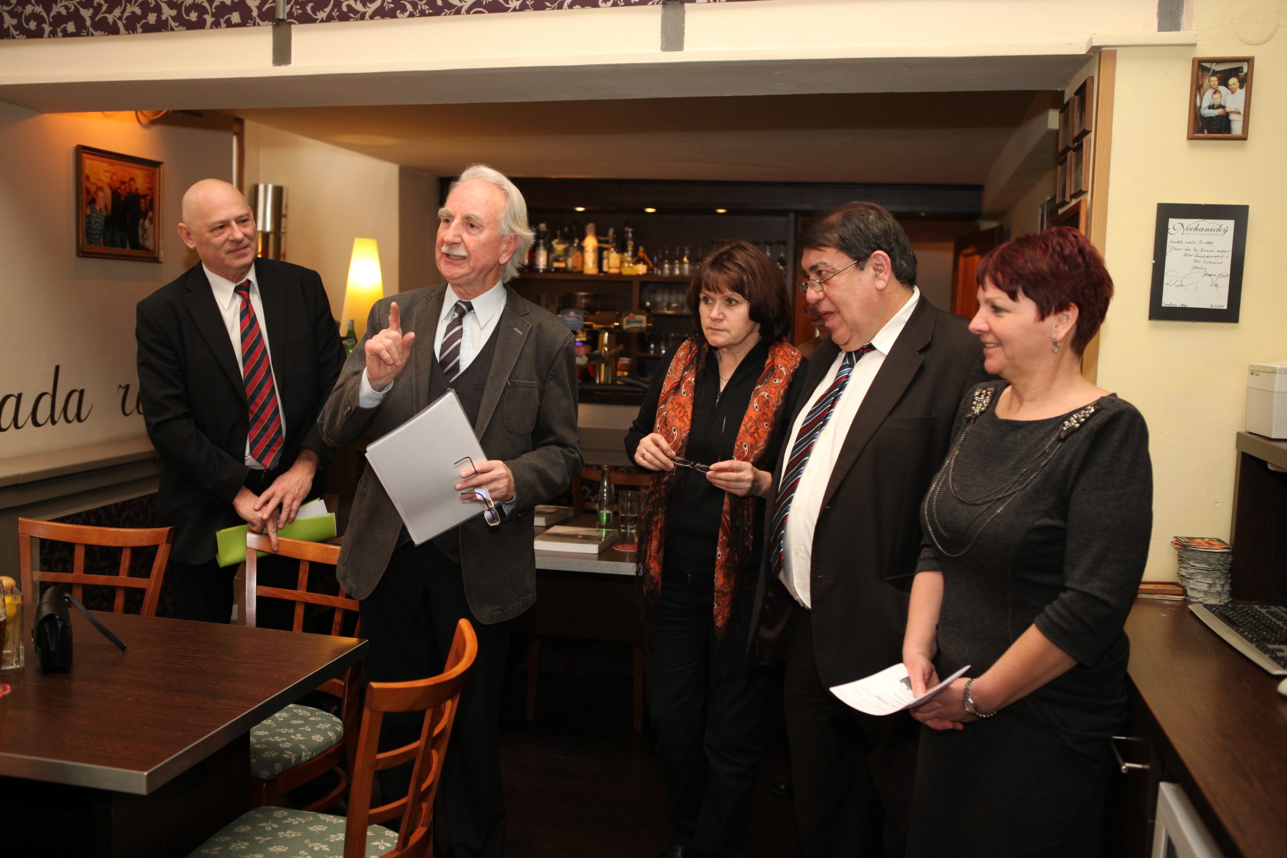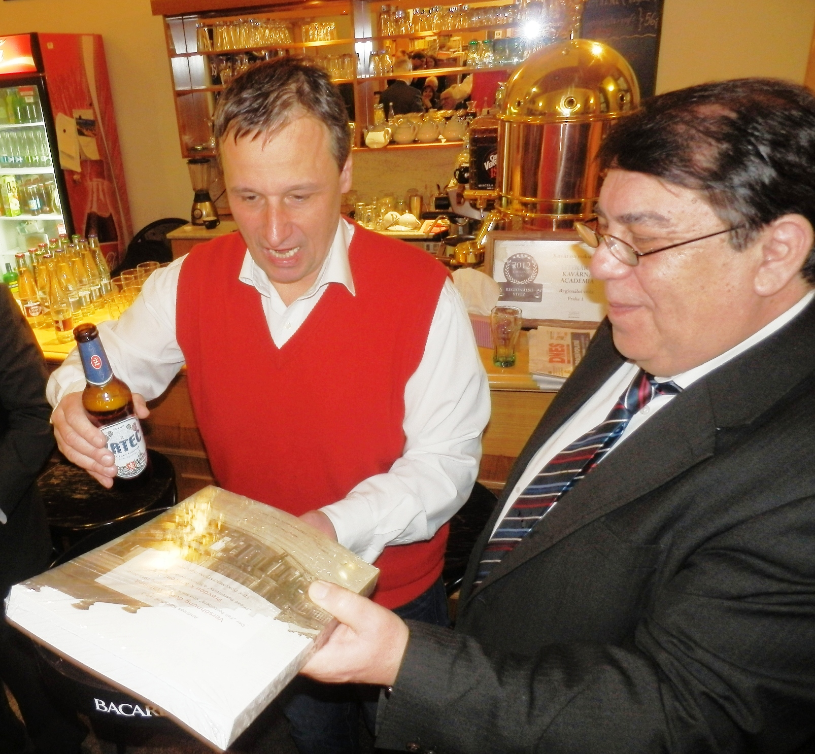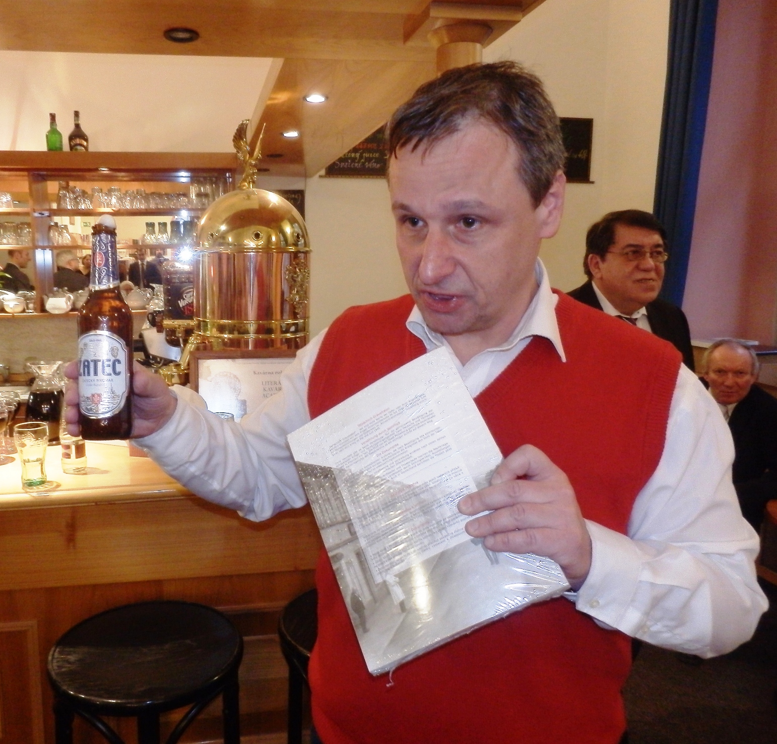 Adolf Funk “tauft” das Buch mit Saazer Bier, Petr Šimáček, Andreas Kalckhoff und Otokar Löbl assistieren